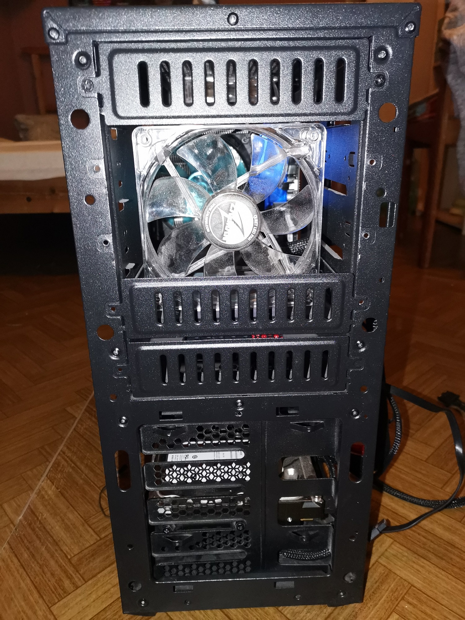 Ne, nakonec jsem se rozhodla, že nahradím i ten zadní, když už, tak už. Takže 1x 140mm dopředu, 1x 140mm nahoru, 1x 120mm nahoru a 1x 120mm dozadu. Dala bych ještě i ventilátor dolů, ať jde ke grafice ještě další vzduch zespodu, ale to se nedá, jak jsem psala, překáží tam ten zdroj.