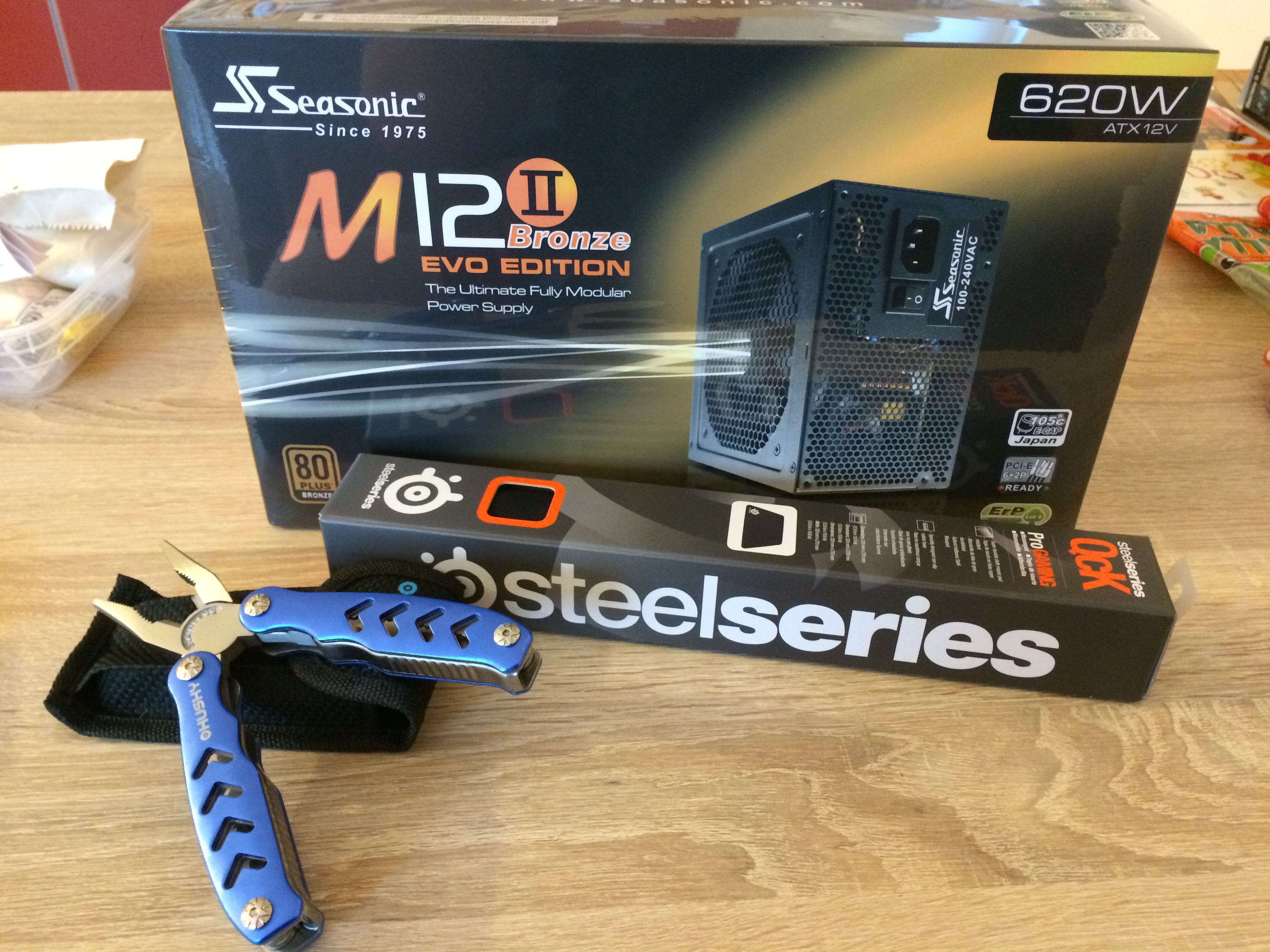 Jelikož mám nedostatečný zdroj na výkonnější grafiku, tak jsem koupil Seasonic 620 W s modulární kabeláží, konečně podložku pod myš, protože doteď hraji na kusu kartonu z Ikea a taky multifunkční kleště :lol: