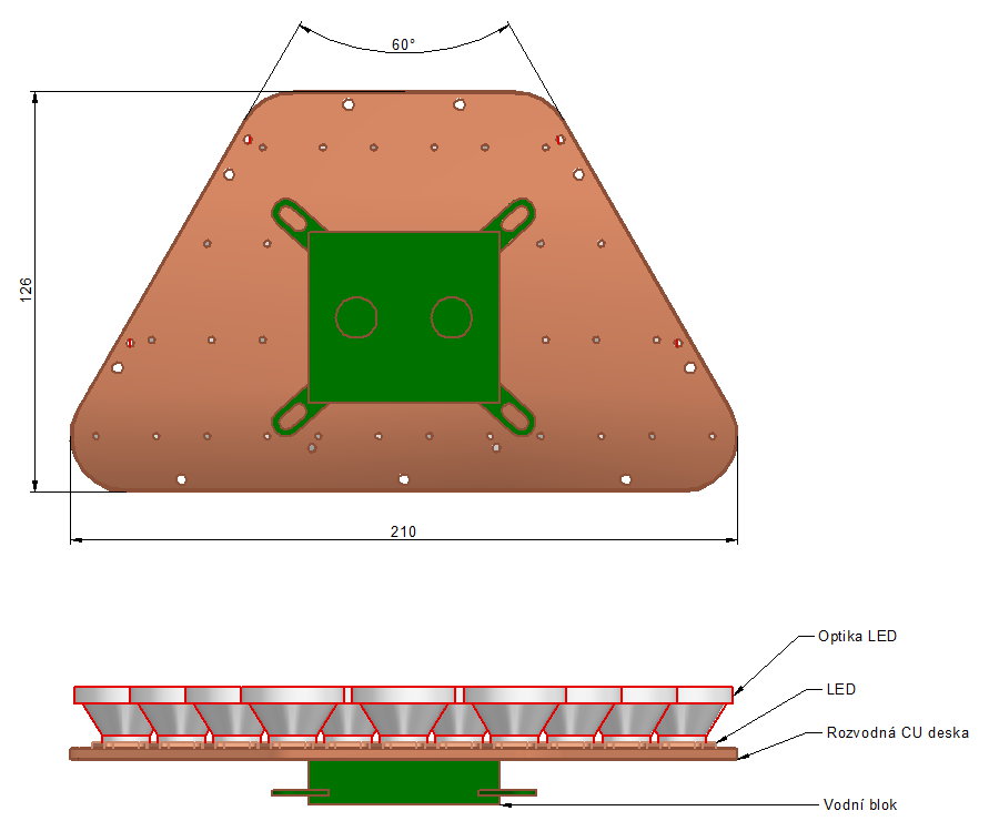 Také moc nevěřím tomu, že ta měděná deska stihne dostatečně převádět teplo z krajních lamp k samotným chladičům. Zkusil bych změnit uspořádání, nebo je rozdělit do ještě menších skupin s příznivějším tvarem (lichoběžník si říká spíš o tři bloky). Úplně nejlepší by bylo kdyby to byla dutá skříň a přímo v ní kolovala chladící voda, ale to by se zase nedala provrtat.