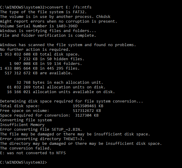 chybu nepíše jen to vyhodí okno že aby se disk konvertoval na ntfs je třeba restart pc to jsem udělala a při restartování to udělalo to samé jako v cmd akorát to nevyhodilo chybu na konci ale naskočil normálně systém a disk je stále FAT32