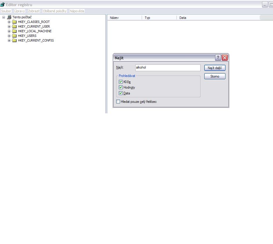 Start - Spustit (tam napiš regedit) a stiskni Enter. Vyskočí ti okno s registry. Klikni do něho a stiskni CTRL+F. Do okénka napiš alkohol a vyber Hledat. Pokud to něco najde, dej pravou myší odstranit a znova Najít další až odstraníš úplně vše. Pak restart.
