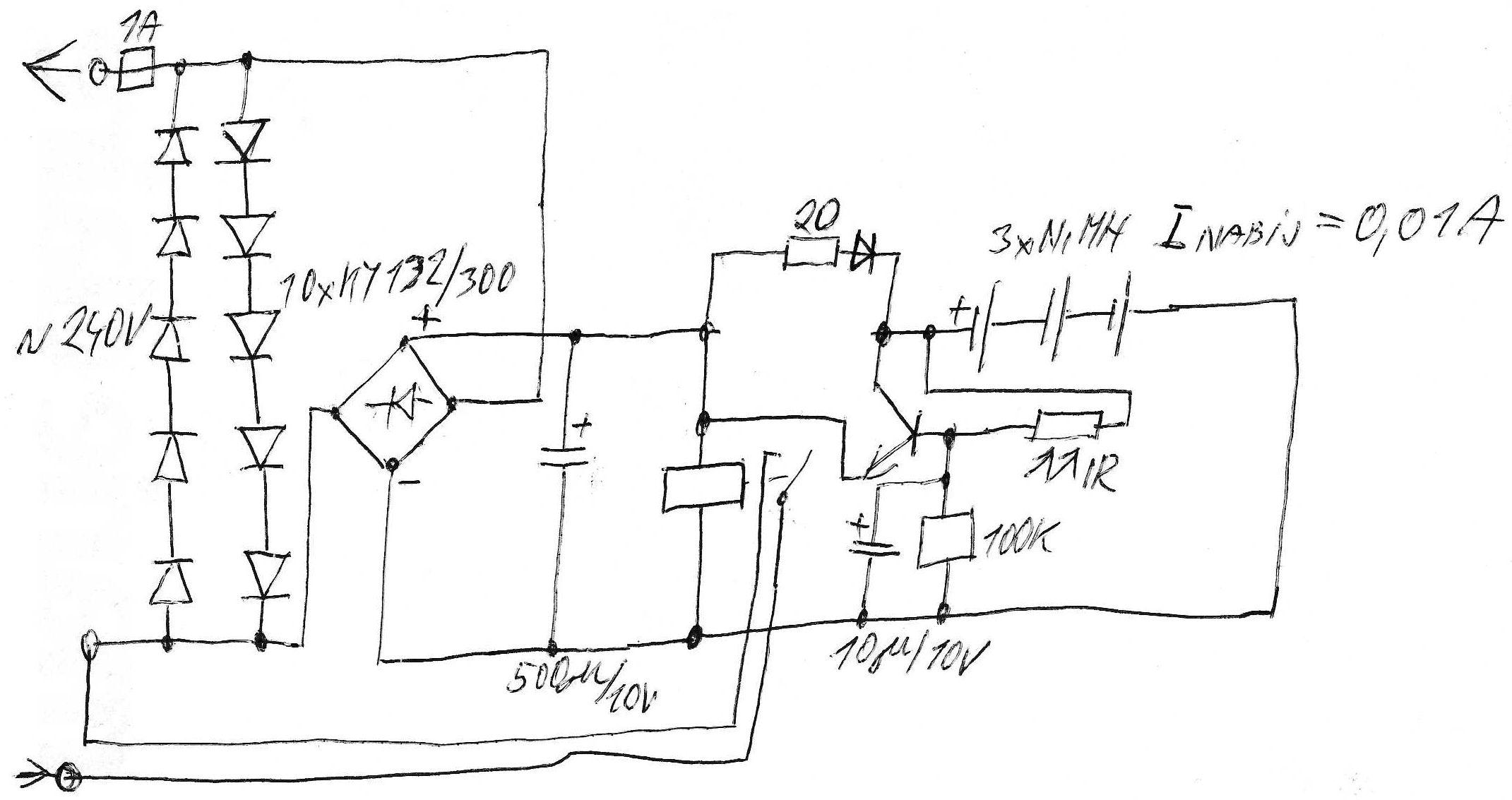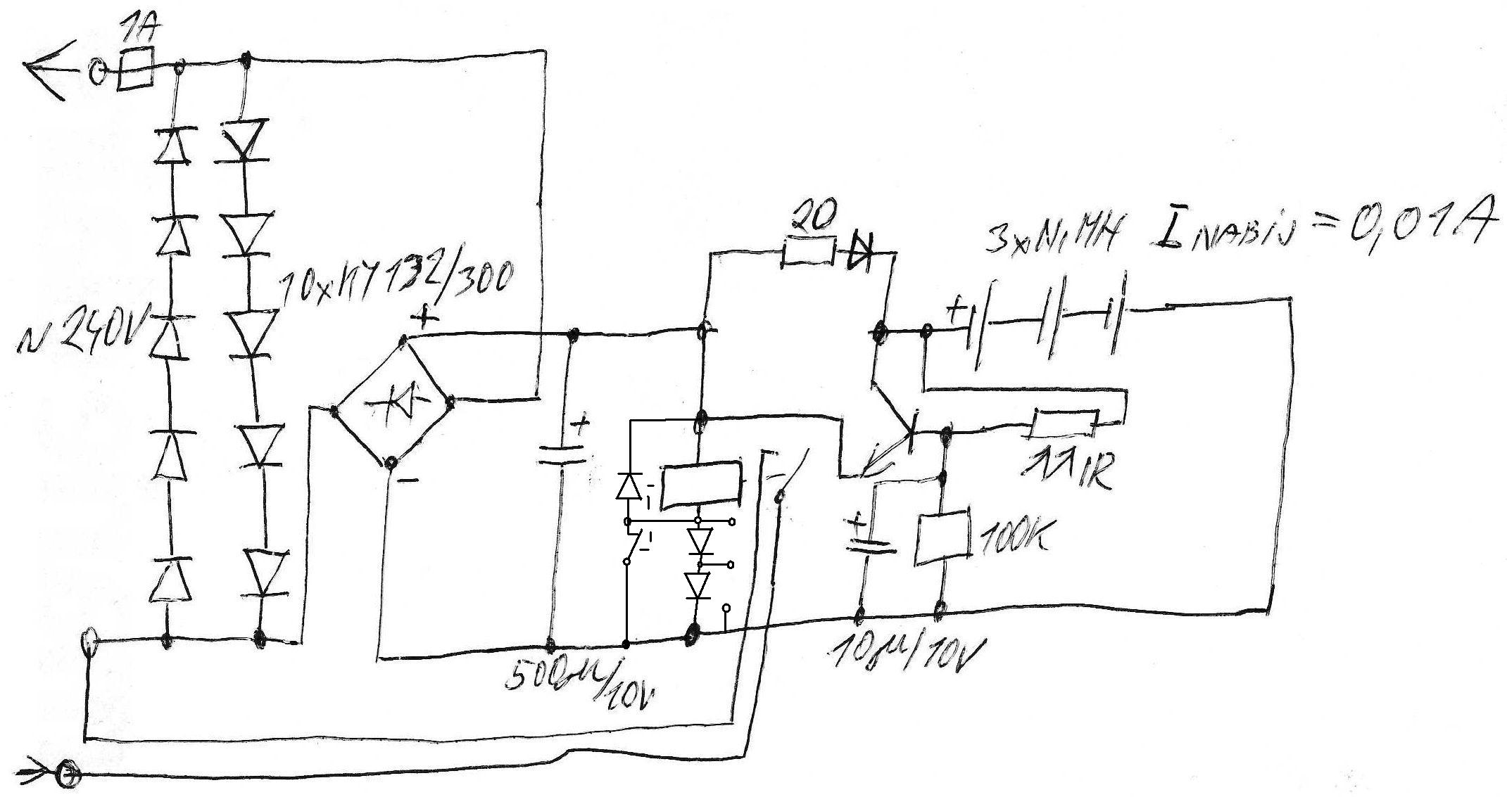 Přes odpor a diodu je při zapnutém spotřebiči nabíjena trojice mini tužkových akumulátorů u níž počítám napětí ve vybitém stavu =4,5V na oddělovací diodě ztratím 0,8V s těmito parametry jsem počítal pomocí Ohmova zákona výslednou hodnotu omezovacího odporu 20ohmů pro nabíjecí proud.