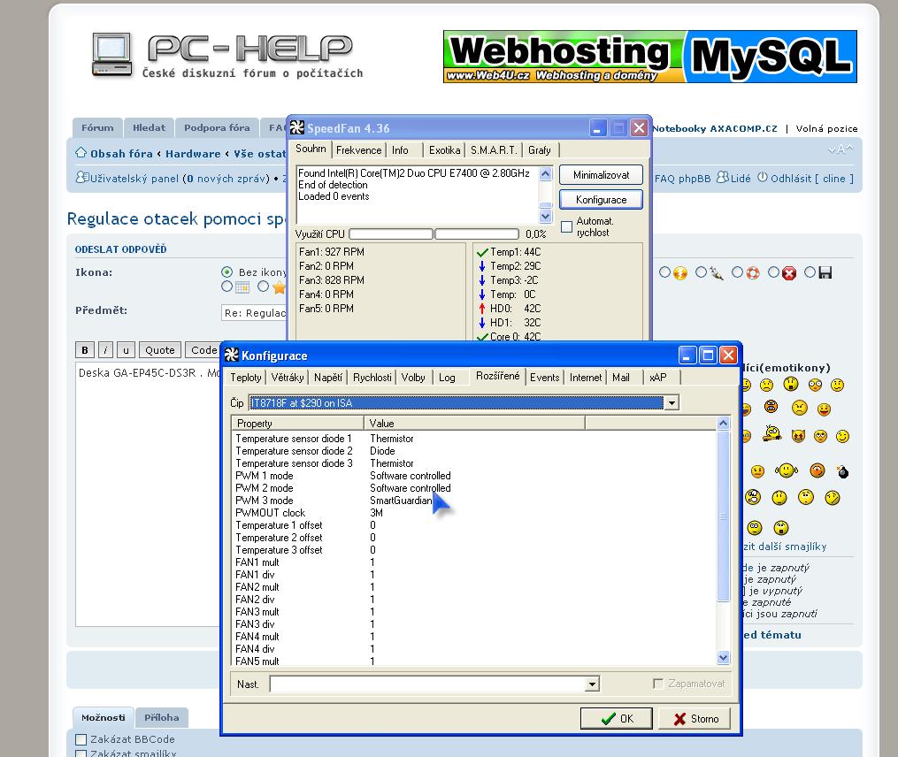 No rano sem jeste cetl par clanku o speedfanu a kdyz nic nezabiralo tak sem si spomel ze tam psali neco o PWM 1,2,3, tak sem tak zkusil neco zmenit a ztichlo to. Akorat nevim proc to nejde regulovat hned na te uvodni strance jak tam sou Speed 01,02,03, kdyz tohle menim tak se nic nedeje