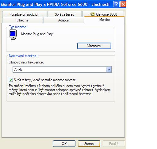 Následující nejde v nouzáku? Pravou myši na Plocha - vybrat Vlastnosti - Nastavení - Upřesnit - Monitor.