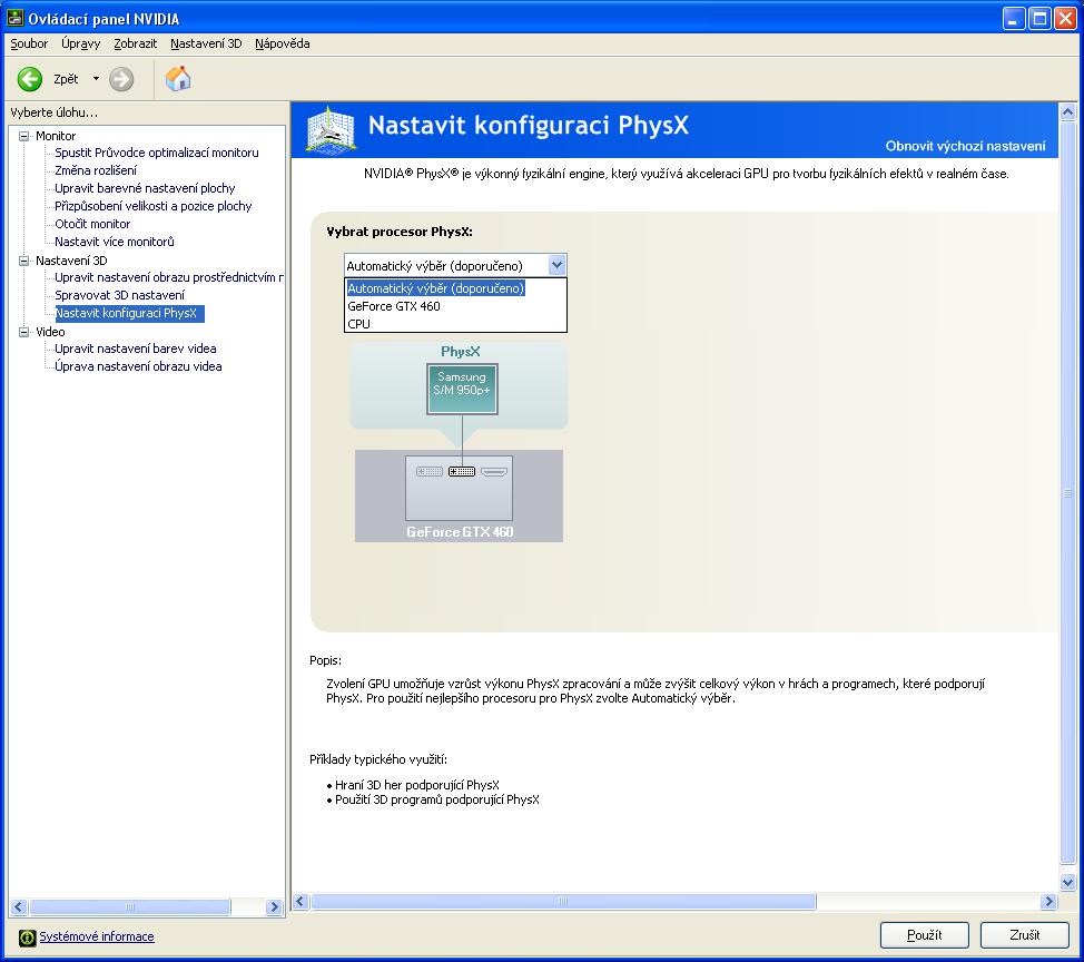 Otevřeš ovládácí panel NVidie a tam v nastavení 3D si zvolíš Nastavit konfiguraci PhysX a tam si z automatického výběru nastavíš, že na PhysX budeš používat GF 8600 GT. Je ale velice málo her, kde by si vůbec využil hw akceleraci fyziky použil. Vzhledem k tomu, že kvůli hw nepodpoře PhysX grafických karet od AMD/ATI, tak v 99% her je připadná fyzika osekaná a tahaná pouze procesorem.