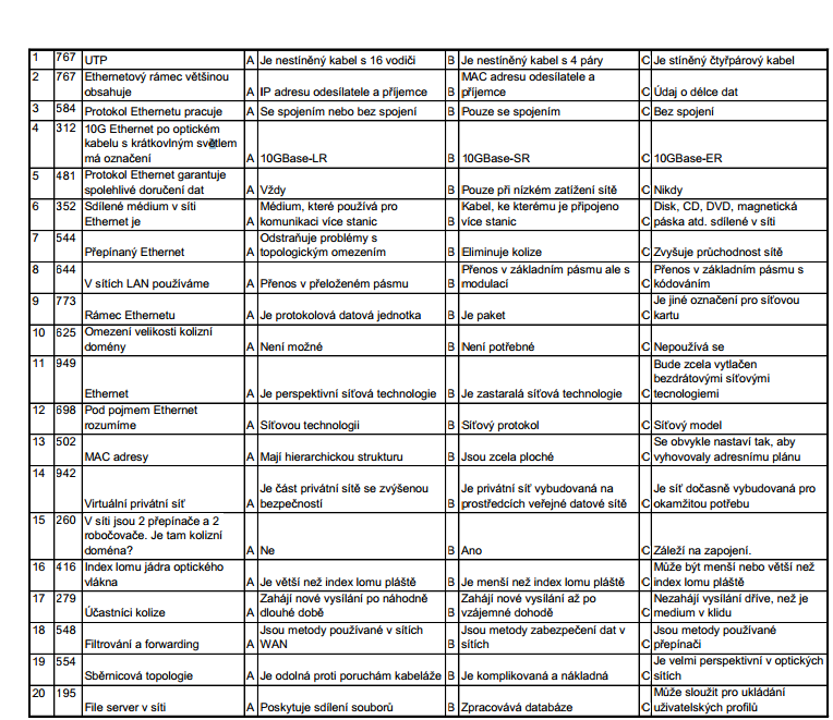 Zdravím, mám problém s otázkami do datových sítí. Budeme psát test (v pátek) a máme odpovědět na 60 otázek a učitel nám odpovědi nedá. Odpovědi jsou na A,B a C. U otázky mohou být všechny 3 odpovědi správné, 2 nebo klidně i 1. Nebo nemusí být žádná správně. Snažil jsem se i pomocí internetu nebo sešitu, ale je to těžké. Mám skoro všechny odpovědi, ale byl bych rád, kdyby to někdo i zkontroloval.