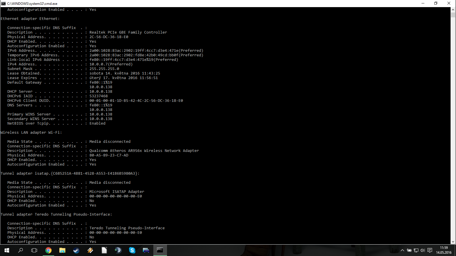 Ping http://www.seznam.cz nešel a ping IP seznamu se vyhodnotil jako 100% ztráta paketů. Při zadání IP do prohlížeče se na seznam nedostanu. ipconfig zde