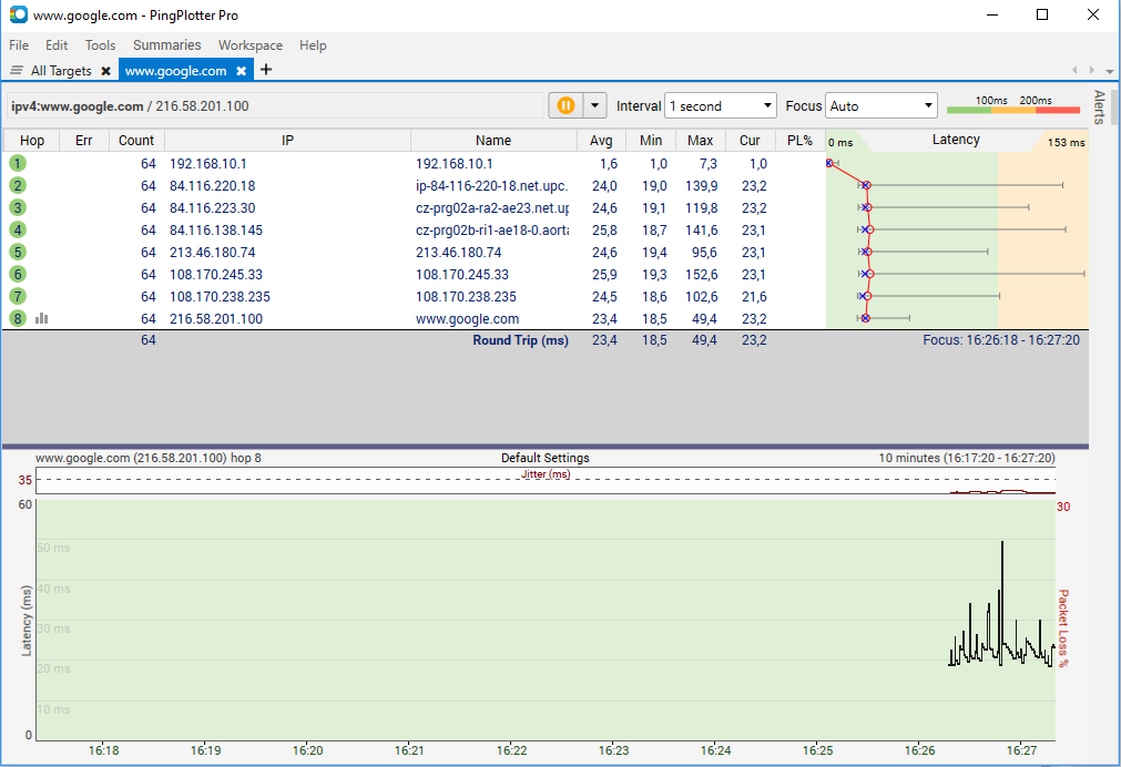 Druhý obrázek je naprosto bez chyb na tvé síti. Nicméně na připojení kabelem jsou odezvy opravdu vysoké, ten skok na 84.116.220.18 je opravdu neobvyklý, screen pošli providerovi. Jak můžeš vidět v diagnostice sítě (můj podpis) odezvy na kabelu by měly být poloviční. Nicméně - je to upc - zkus totéž při vypnuté(tých) TV, zda se odezvy změní.