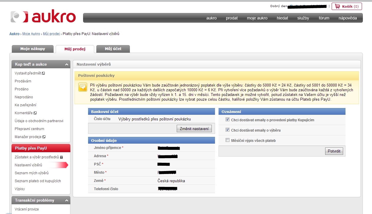 Nastudoval jsem, co píše o PayU Aukro a narazil jsem na problém. Měla by být možnost si nastavit výběr peněz z PayU na svůj bankovní účet. V sekci, kde se to má nastavovat bohužel tuto možnost nemám, ale mám tam pořád jen výběr poštovní poukázkou. Nastavení výběrů by mělo vypadat takto: http://static.allegrostatic.pl/site_ima ... vyberu.png ale u mě je to tak, jak je na obrázku v příloze. Poradíte prosím, jak si nastavit výběr na účet?