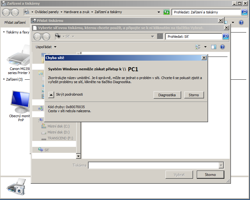 Přikládám postup při přidávání tiskárny v PC2 a chybovou hlášku, kterou vyhazuje PC2 když se snažím otevřít PC1 v síti. Nemůže být problémem to, že u PC2 není povolen DHCP, jak jsem psal výše? V nastavení routeru jsem našel také firewall, nemám ho také zrušit? Pokud jsem někde opět postupoval špatně, omlouvám se a prosím o vysvětlení postupu.