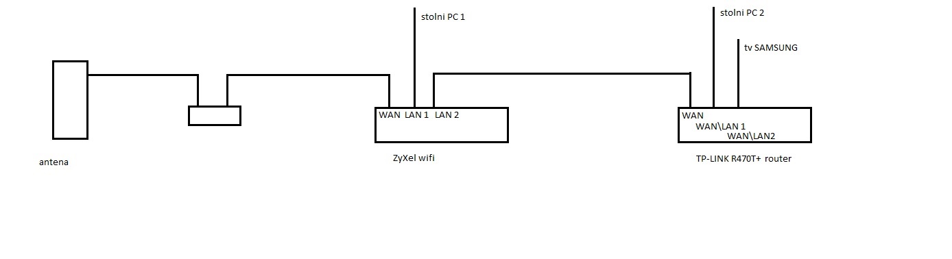 antena AP a z toho mam kabel do wan portu wifi zyxel tam je z prvniho lan portu prvni stolni pc z druheho lan portu mam kabel do wan portu wifi tenda a z toho mam z prvniho lan portu druhy stolni pc a ze ctvrteho lan portu tv samsung na vsem mi net de ale na tv mi to dela krizek u ping brany