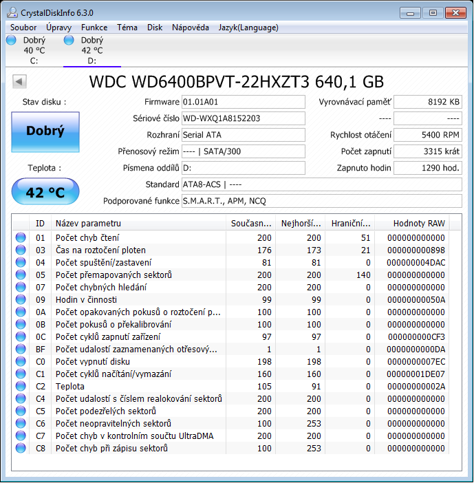 Tohle mi vyhodil ten CrystalDiskInfo. Disk D: je ten, na který ukládám. Zkusím ještě stáhnout a uložit na druhý disk.