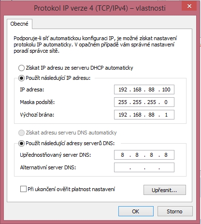 Dostal se mi do ruky tento stroj. Nemyslím si, že ho využiju, takže bych ho chtěl prodat. Ale netuším, jak to mám otestovat. Může mi někdo zkušený poradit, jak na to? Napájím ho adaptérem s 12V a 0,8A. PC propojím s LAN2 konektorem. Centru sítových připojení změním nastavení (na obrázku). V prohlížeči zadám 192.168.88.1 . Nic se však nenačte. Určitě něco dělám špatně, s těmito přístroji jsem nikdy nepracoval.