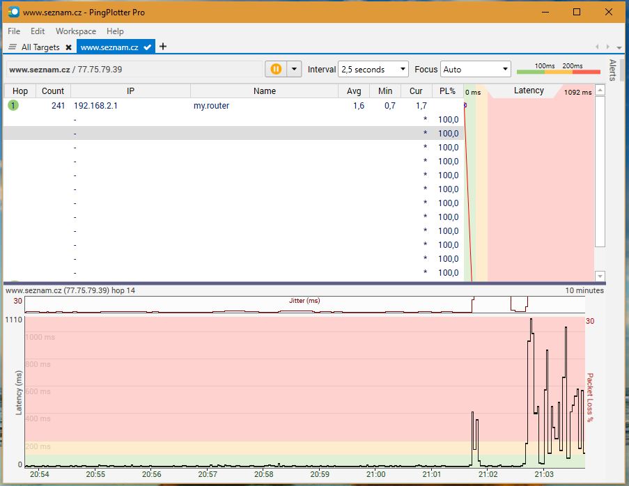 Stáhni https://www.pingplotter.com/freeware.html, nainstaluj a spusť. Do pole Target Name napiš http://www.seznam.cz, Trace Interval zvol 2,5 second a klikni na zelené tlačítko "play".