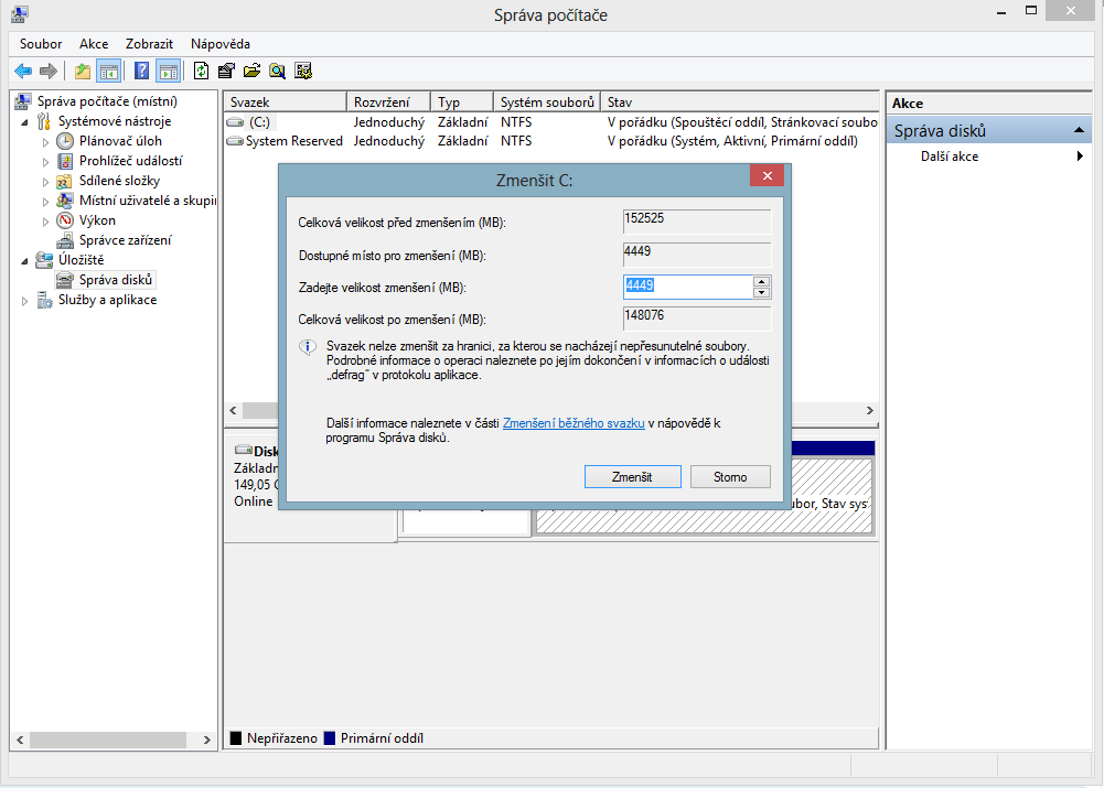 Ahoj, nevím proč, ale mám disk o velikosti zhruba 160 gb (windowsy to zmenšily asi na 150gb) no.. Ten disk chci rozdělit na dva, jenže ačkoliv mám místo asi ještě 60gb, tak to nemůžu rozdělit víc jak 4gb.