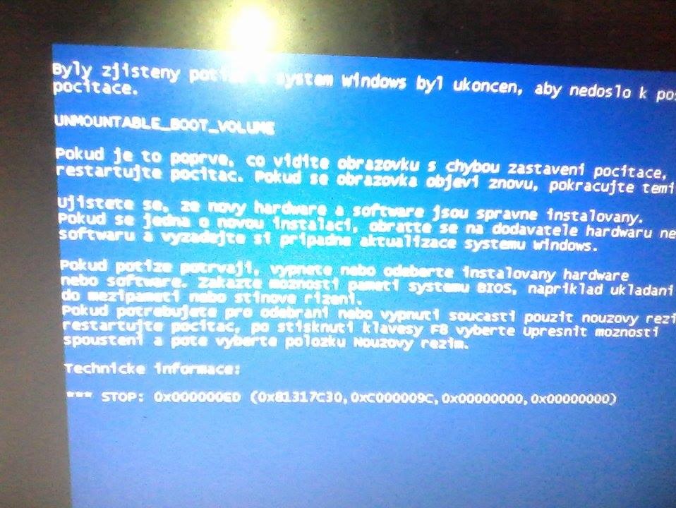 Dobrý den, měl jsem se mrknout kamarádovi na jeho ntb od hp už taky pár let starý(až asi moc). Spustím a vida modrá smrt a píše mi to UNMOUNTABLE_BOOT_VOLUME a pod tím úplně dole stop:0x000000ED ostatní na fotce. Operační systém je windows xp. Nemohu ani na plochu nic jinak bych to zkusil něják opravit sám. A když do toho dám cd na installaci windows xp tak mi to hodí chybu soubor sisraid4.sys způsobil neočekávanou chybu. Omlouvám se za nějaké hrubky píšu to v afektu naštvanosti.