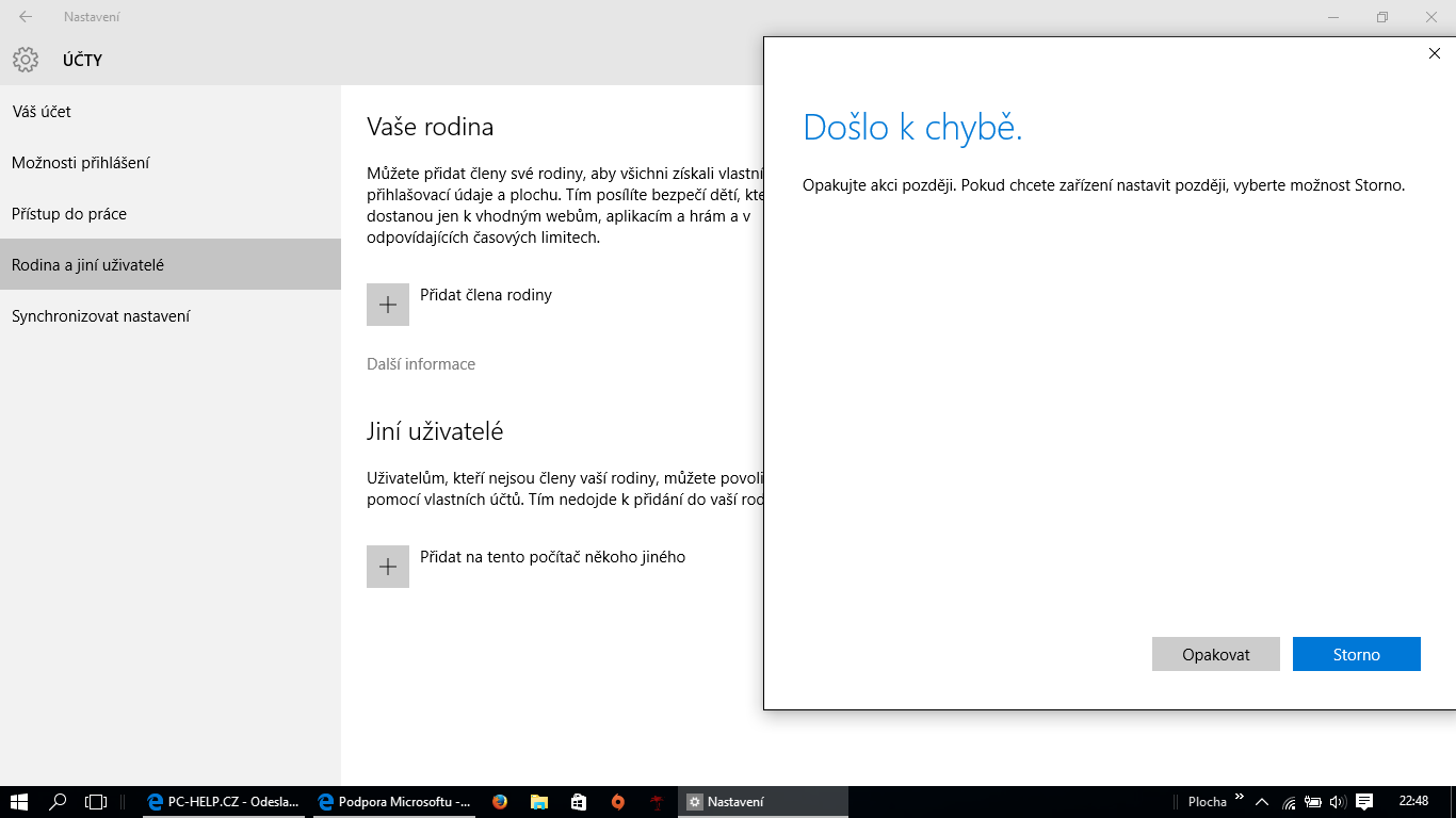 Dobrý den, mám čerstvě nainstalovaný Windows 10 a mám dost velký problém. Nejde mi přidat jakýkoli další účet,kromě mého stávajícícho. Aktualizace jsou všechny nainstalované a předešlý ope.systém byl Win 8.1. Počítač je dost silný na win10 tudíž opravdu nevím,co s tím, je to pro mě dost závažný problém. K internetu jsem připojený a nefunguje ani jedna z možností a pořád píše to samé,co vidíte na fotce - ani přidat člena rodiny, ani přidat na počítač nikoho jiného. Děkuji za pomoc a přeji všem pěkný den :)