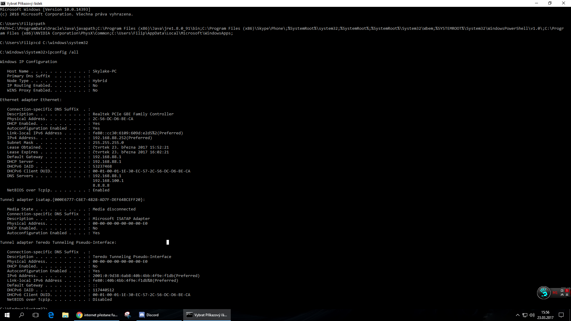 tedy znovu, ip config jsem našel,po otevření vyletělo nějaké okno a hned se zavřelo, prosím o radu jelikož nevím co a jak. opět internet vypadnul kolem 1 hodiny v noci. Děkuji za pomoc