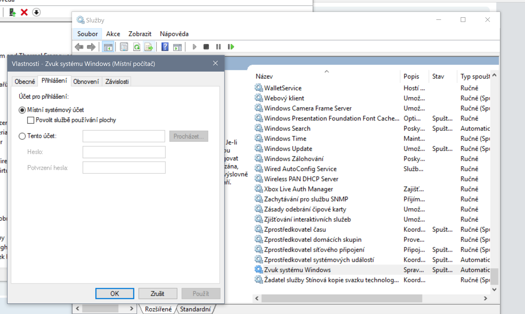 po 5 hodinách neúspěšného snažení bych Vás chtěl poprosit o pomoc, při propojení mého Asus UX305CA a Windows 10 s bluetooth reproduktorem se seká zvuk, takže jsem někde na internetu našel změnu ve services.msg a zvuk systému windows/přihlášení - změna z tento účet na místní systémový účet - screenshot 1.