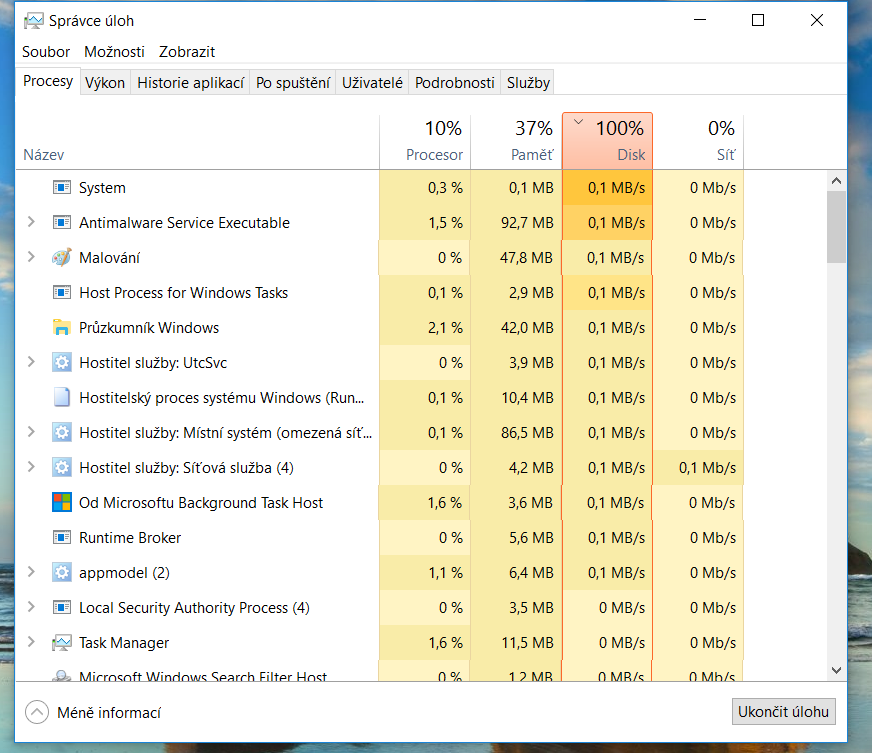 Harddisk mi jede pořád na 100%. Instalace aktualizací se tváří, že chce jet, ale nejede.