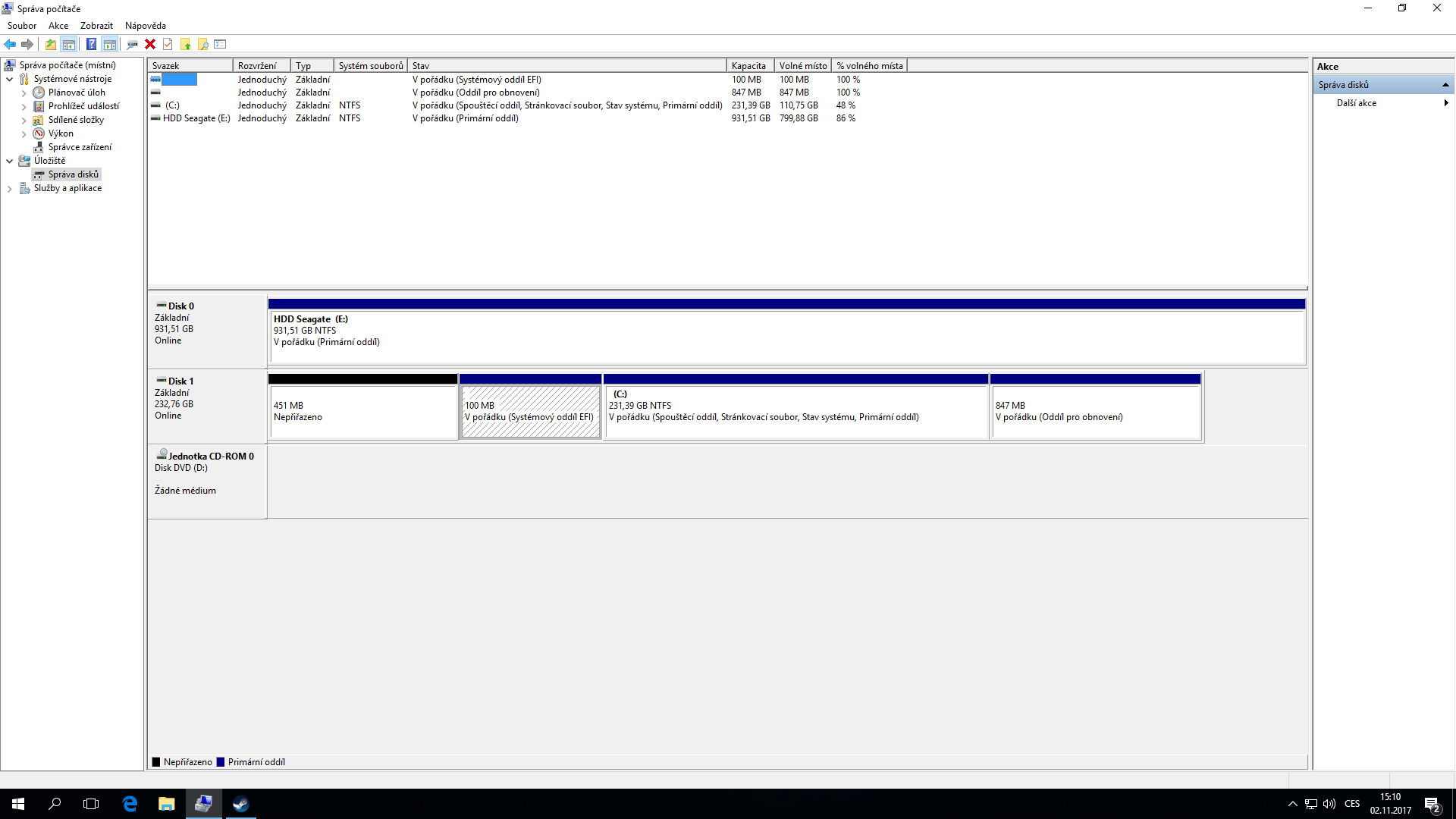 SSD nechaj tak , ako je.Ten oddiel 99MB + 2x450MB patrí k disku Seagate , takže po ich odstránení a získaní nepriradeného voľnéko miesta to priradíš k disku E Seagate.