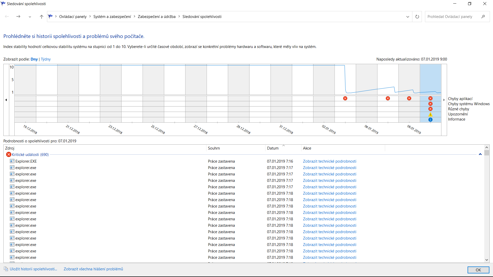 Takže problém vyřešen. Ve správci nebylo nic na 100% vytíženo, jen jak pořád kolem dokola nabíhal a pozastavoval se Explorer tak bylo celkové vytížení 65-90%. Bohužel instalace nebo odinstalace čehokoli byl problém, protože docházelo k refreshi plochy a nedalo se tím pádem ani nic otevřít. Problém byl pravděpodobně při aktualizaci (update), že došlo k přerušení či dokonce vypnutí ntb. Vyřešil jsem to ukončením Exploreru a ostatních nepotřebných procesů ve správci a poté spuštěním Exploreru jako správce, poté již naběhla plocha, update proběhl bez problémů. Takže díky a přikládám soubor s chybami.