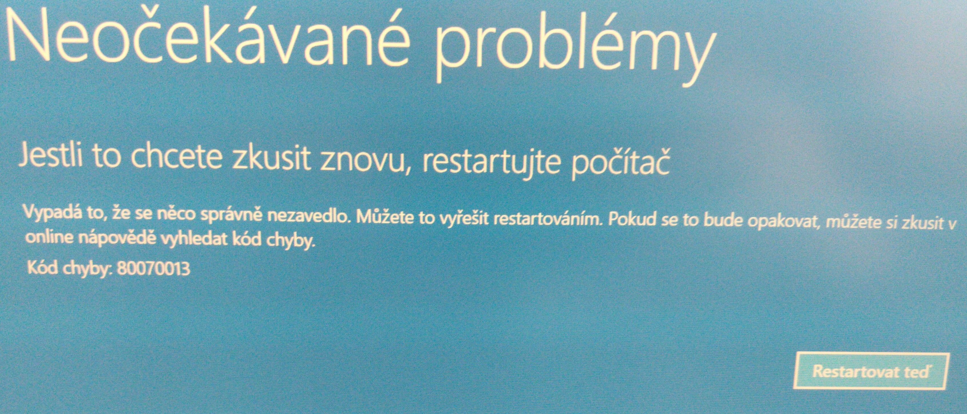 Snažil jsem se najet do nouzového režimu přes Shift + Restartovat, ale vždy když jsem klikl na kteroukoli možnost zobrazil se mi kód 80070013 a možnost nouzového režimu nedělá vůbec nic a počítač se spustí do normálního režimu