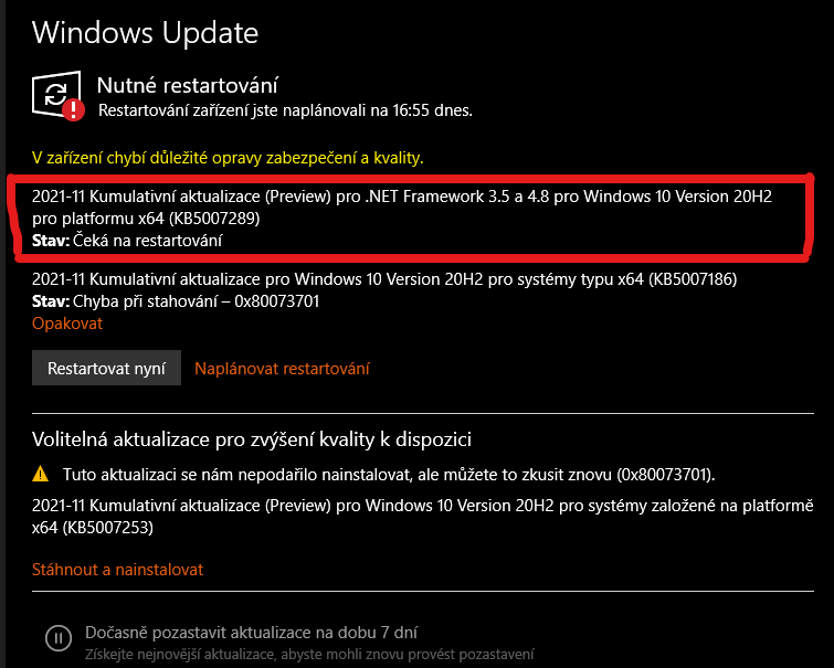 Některé aktualizace ale jdou nainstalovat, třeba ta pro .NET Framework