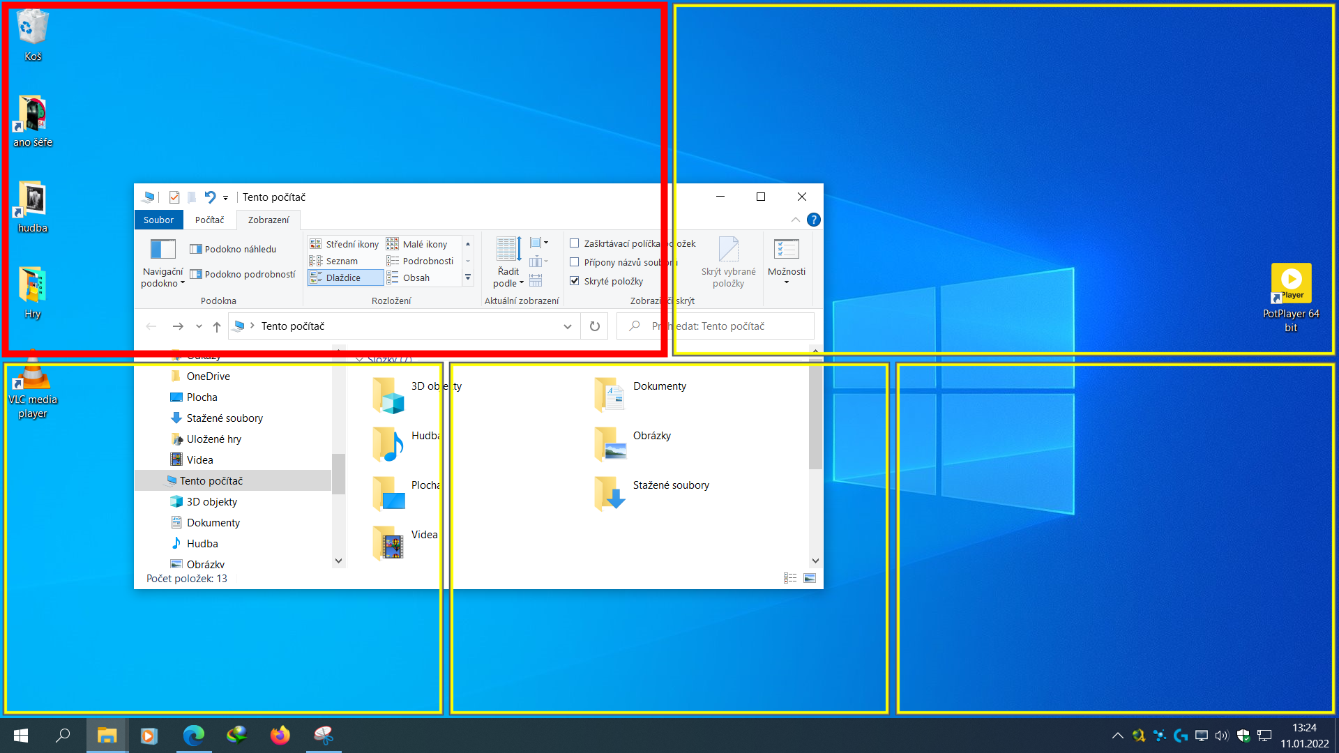Prosím vás, nevíte někdo jak se tohoto zbavit ? Vůbec nevím co jsem kde nastavil. Děje se to jen při přesouvání okna, průzkumníka, či programu, v té chvíli se mi to srovná přesně do velikosti jednoho z 5-ti vyhraničených oken, které se tam zobrazí, tzn. nemůžu zvětšit okno a poté přesunout, zase se zmenší do toho rámečku jak je to vyobrazené.