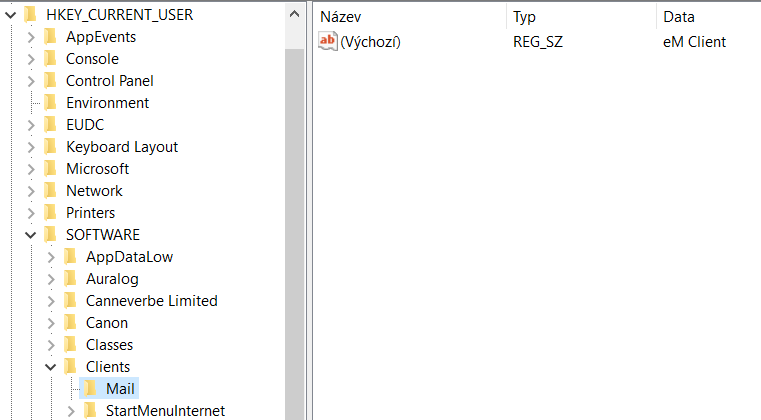 Mě tam složka "Mail" chyběla, tak jsem jí vytvořil ručně. V této složce musí být řetezcová hodnota a do hodnoty se musí nastavit mázev programu - viz obrázek.