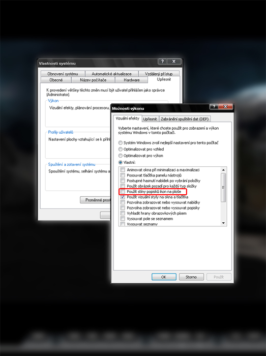 TENTO POČÍTAČ - VLASTNOSTI - UPŘESNIT - NASTAVENÍ - VIZUALNI EFEKTY - POUŽÍT STÍNY IKON NA PLOŠE