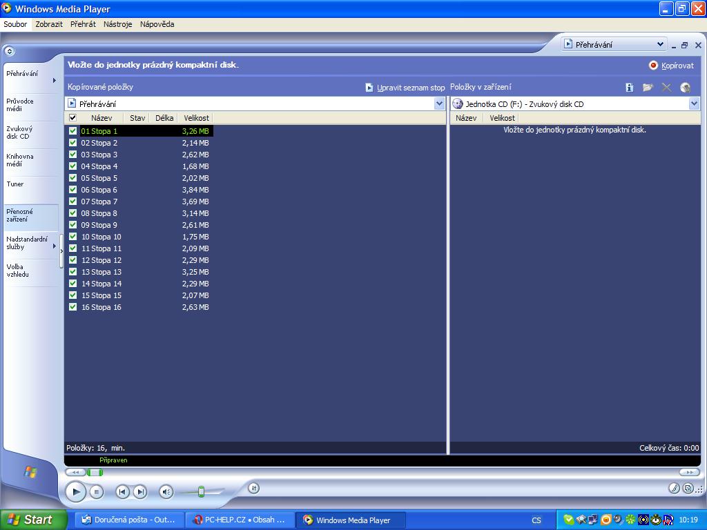 V PC má vypalovací DVD mechaniku.Když spustím Windows Media Player, kliknu na záložku "Zapsat na disk CD", vytvořím seznam skladeb k vypálení a poté chci kliknout na tlačítko "Zahájit proces vypalování".