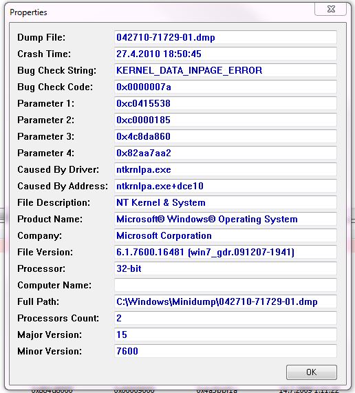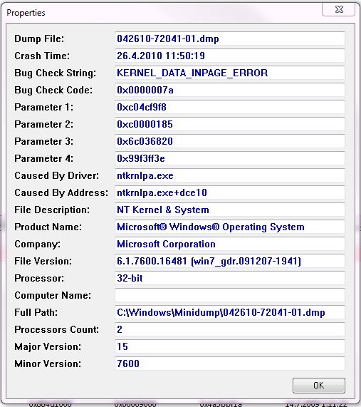 Počítač při startu po smrti dlouho načítá. Poslední modrá smrt ze dne 27.4. a 26.4. V příoze 2 dmp screeny.