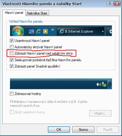 Zdravím nemohu přinutit hlavní panel, aby se nezobrazoval nad ostatnímy okny. Ve vlastnostech hlavního panelu to nemám zatržené, ale přesto po najetí systému sůstává nad ostatnímy okny. Viz obr.