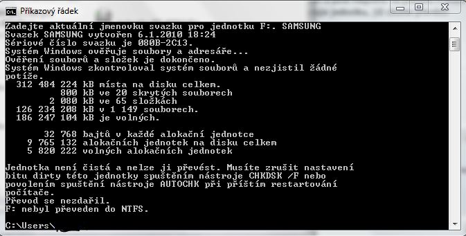 Převod existujícího svazku systému souborů FAT nebo svazku systému souborů FAT32 na systém souborů NTFS provedete podle následujících kroků: