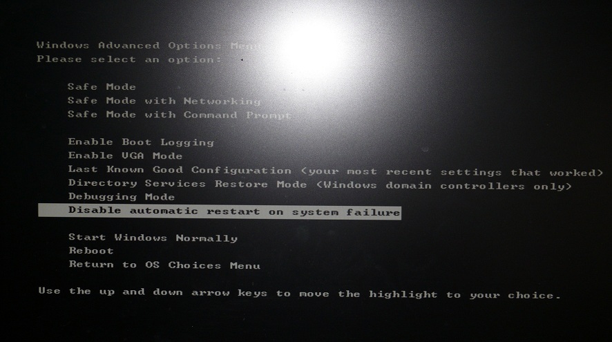 Disable automatic restart on system failure, v češtině je to Zazázat automatické restartování při selhání systému