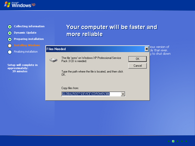 Můj problém začal s virem, který mi upravil soubory win., a po restartu pc mi smazal hall.dll a tak jsem to řešil instalačním CD , kdy jsem tam nakopíroval tento soubor, poté šlo o další soubor, tak jsem tam dodal i toto( knihovnu popř.) a poté byl problém se zavaděčem. Tak jsem pustil Obnovu systému před CD, jenže jsem se dostal po restartu do problému kdy mi před obnovou systému( nebo-li bezformátové instalaci ) systém zakousne u chybějícího souboru ( Viz. obrázek, jde tedy o SP2, toto je jen z netu příklad (příloha) Nicméně nejde na nic kliknout ani zadat nějaký příkaz,takže jsem na mrtvým bodě.... Byl mi doporučen reinstal WIN...