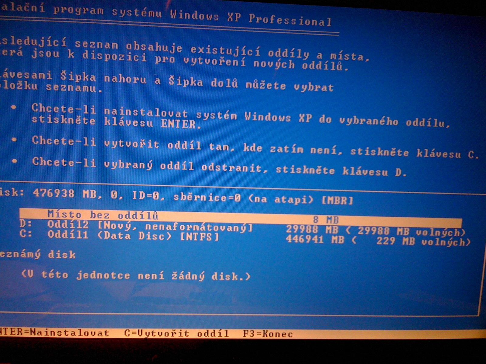 To je samozřejmé. Ty Windows XP teď musíš nainstalovat znovu. Na té logické jednotce kterou jsi odstranil byly Windows, takže jsou momentálně pryč.