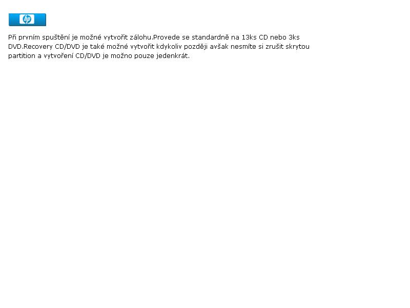 .Při prvním spuštění je možné vytvořit zálohu.Provede se standardně na 13ks CD nebo 3ks DVD.Recovery CD/DVD je také možné vytvořit kdykoliv později avšak nesmíte si zrušit skrytou partition a vytvoření CD/DVD je možno pouze jedenkrát