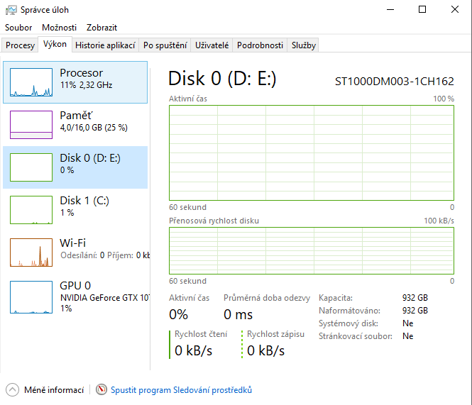 Omlouvám se za delší neaktivitu. Každopádně jsme si nějak nerozumněli, já jsem poslal screen ze správce úloh. Myslel jsem si že myslíš psrávce úloh, ale sledování prostředků je jak ve Windows 7 tak 10 naprosto stejné. Takže, když si dám seřadit podle zatěž (jako ve tvém screenu) tak mi to tedy zobrazí jak disk E tak C? Jde mi o ten E