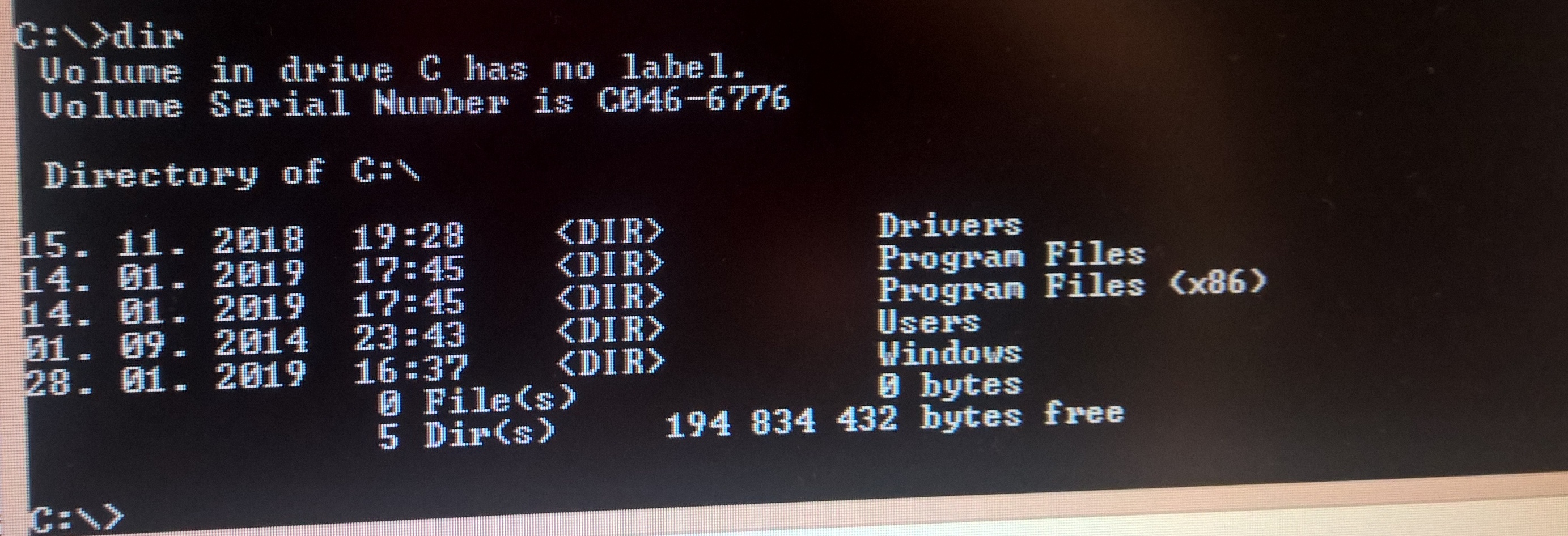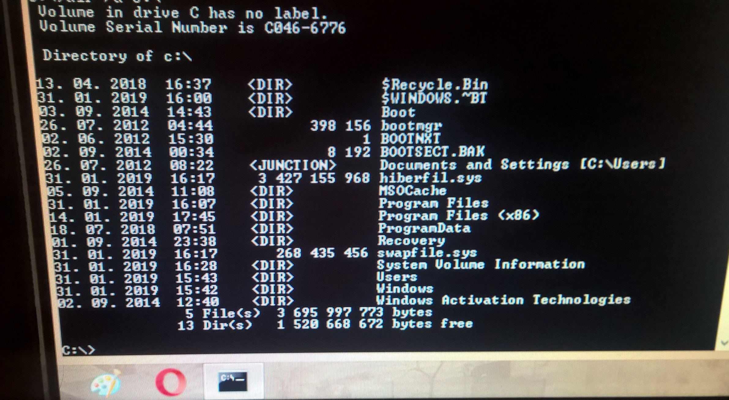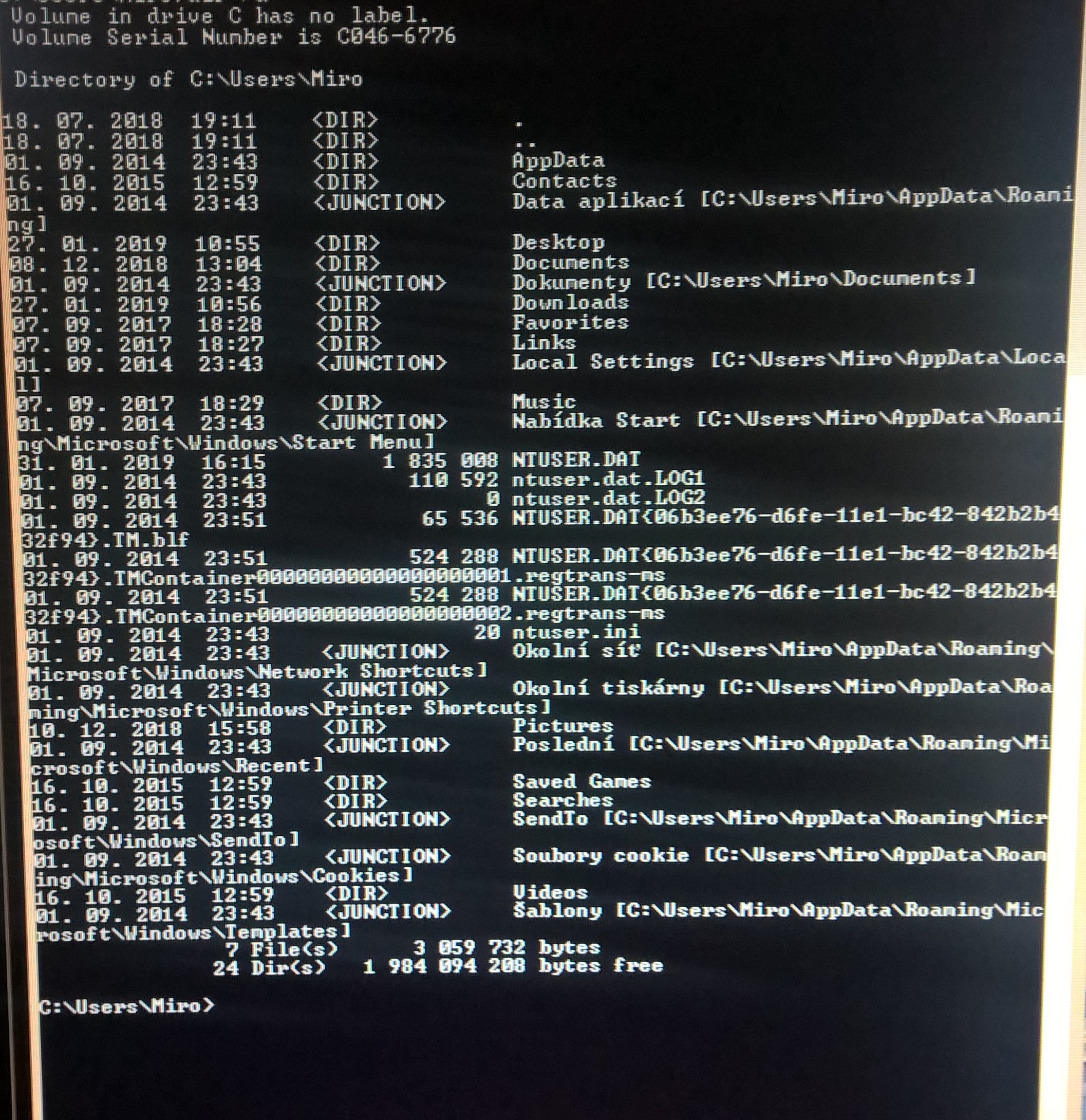 Screen uzivatelske slozky neni to, co jsem chtel. Vepis tedy 'dir /a c:\'