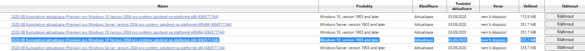 Poslední verze, u které se povedla aktualizace byla verze 2004 (build OS 19041.450).