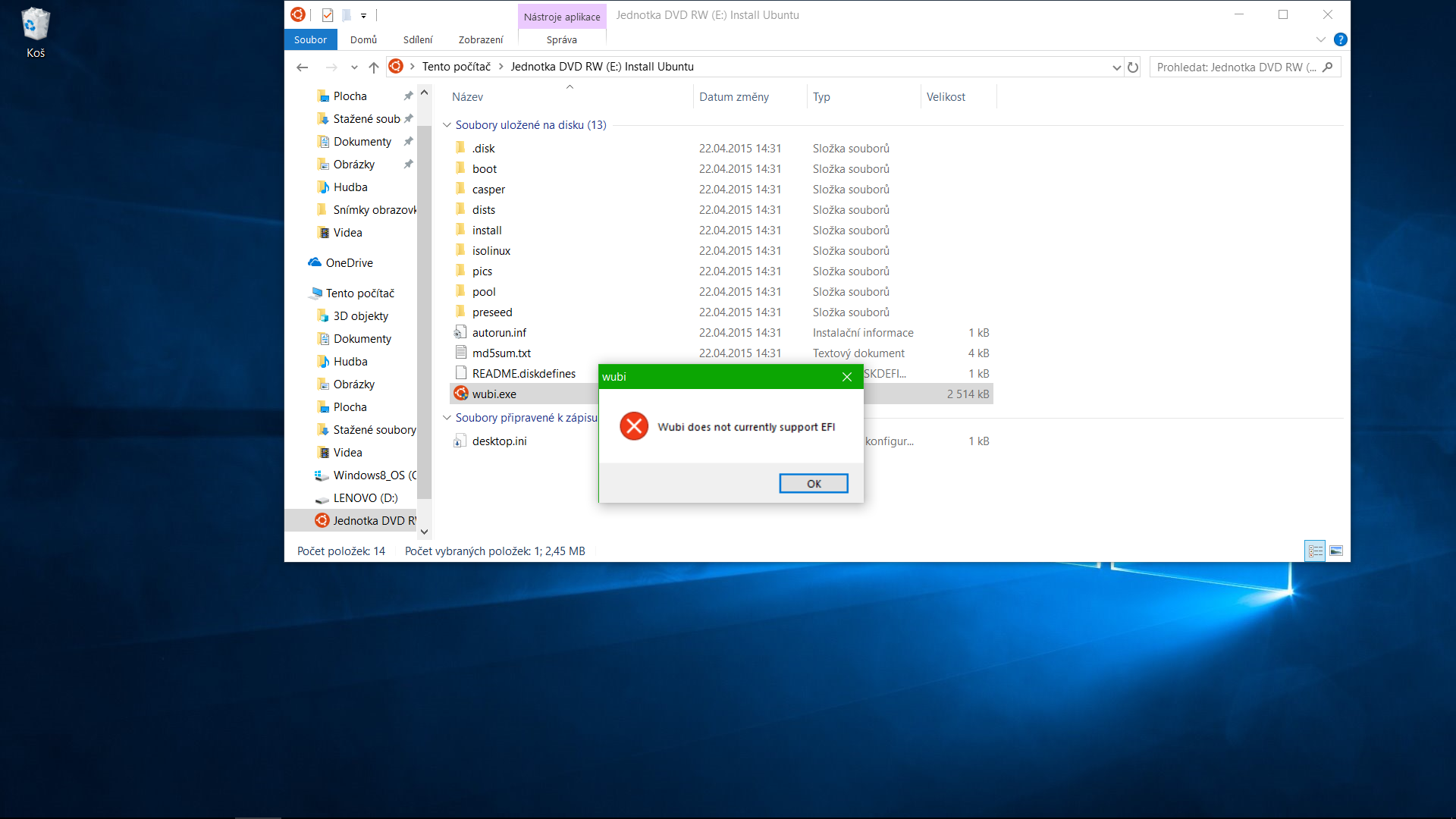 Mám to vypálené na CD, ale když se snažím nabootovat, tak to píše "Wubi does not currently support EFI"