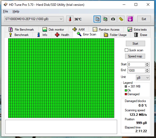 Právě dělám Error scan. Aktuálně jsem na pozici 160 GB a vše je zatím zelené. Mám tedy test přerušit? Do karty Health juknu, až po skončení tohoto kroku. Test čtení - máte na mysli benchmark?