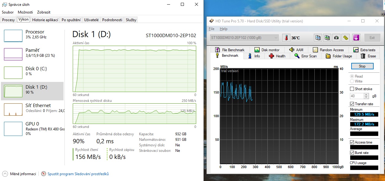 Veškeré programy jsem vypnul a aktivita disku byla na 0%. Pak jsem zapnul benchmark a stoupla na zhruba 90%.