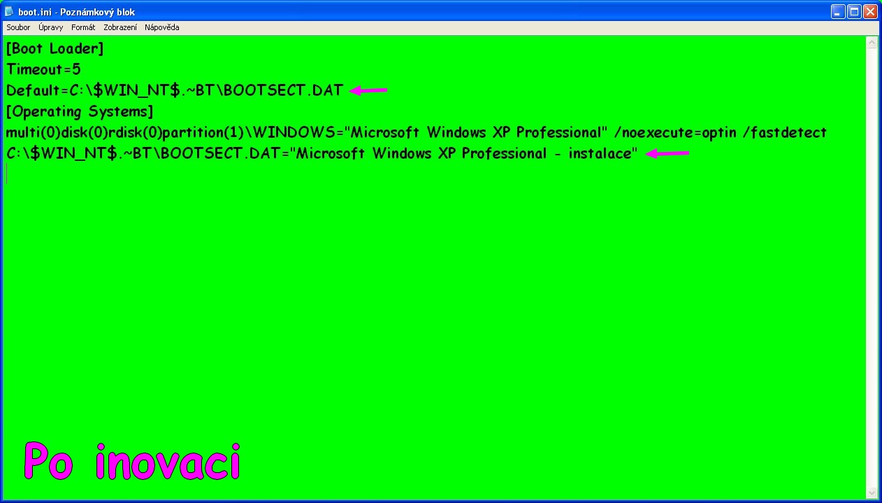 Máš co jsi chtěl. Jasně jem popsal možnou příčinu problému a její řešení. Rozhodl ses sám jinak, máš s tím práci navíc, a nakonec to skončí novou instalací, která možná neprojde. Budeš muset pohledat originální medium, ze kterého byla počáteční instalace a postupně dohrát všechny servicepacky a další aktualizace. Přitom stačilo nahrát jiný zavaděč a bylo po problému.