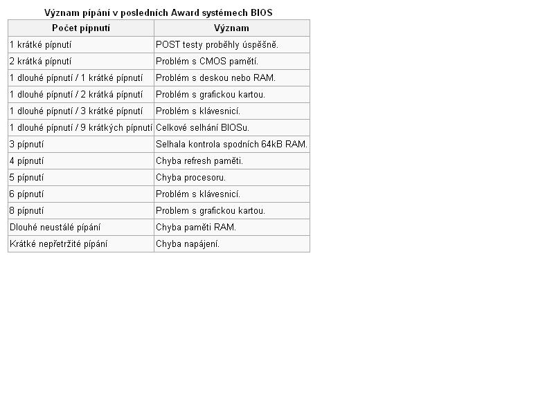 Pak by to dle typu Biosu mohla být chyba RAM. Zkontroluj jestli sedí ve slotech a je-li více modulů, nech tam jenom jeden.