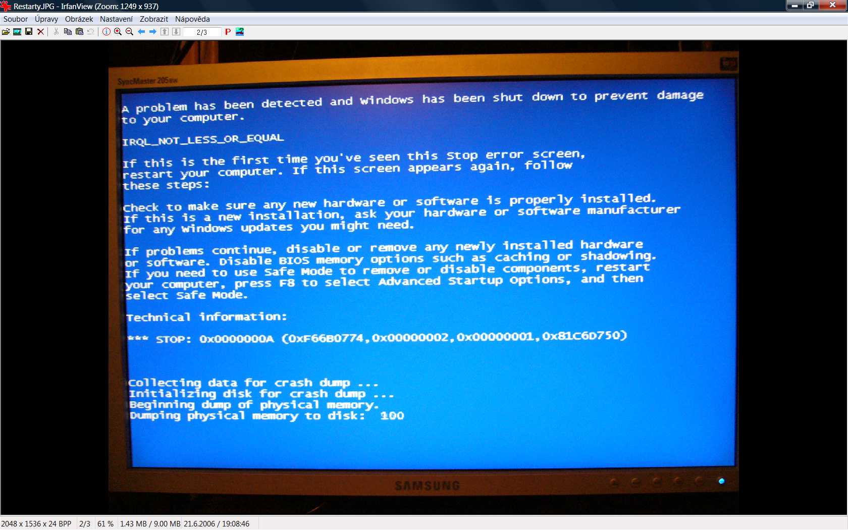 Ahoj, potřeboval bych prosím poradit. Mám Vistu Premium OEM, Celeron 2,6 Chz, 1GB RAM, GF 7600,1x HDD120GB ATA (systémový), 1xHDD320GB SATA (data). Vista mi padá když třeba pouštím internetovou TV, přenáším data z videokamery na HDD, kopíruju data z HDD na ext.USB HDD, nebo někdy úplně náhle i když je PC v nečinnosti. Dále mi nefunguje to nový tlačítko na hl. panelu pro vypnutí PC, musím vypínat klisicky v roletkovém menu.