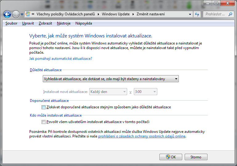 V případě nastavení aktualizací (4. etapa) je třeba provádět aktualizace ručně - nicméně výhoda je, že je lze zkontrolovat, a pokud tam visí některá ze zmíněných aktualizací, či dokonce přímo instalace Win10, lze ji jednoduše zatžítkem zrušit a skrýt.