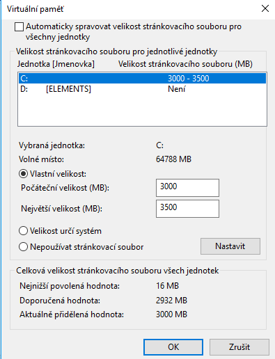 Nastav at velikost strankovacího souboru nastaví systém. Většinou má být velikost stejná jako máš velikost RAM, když už to chceš ovlivňovat manuálně